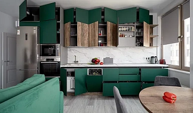 Кухня на заказ с открытыми верхними полками – подходящее решение для небольших помещений. Подобные модели позволяют сохранить воздушность и свет, не перегружают помещение. При этом на полках удобно хранить высокие емкости, стопки тарелок и банки со специями.