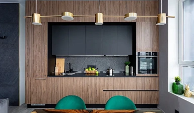 Над обеденной зоной тоже потребуется дополнительная подсветка. Для этого можно использовать светильники на подвесах, люстры, споты. Выбор во многом зависит от дизайна помещения.