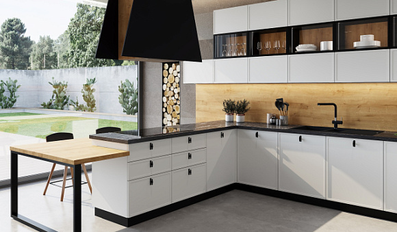 Широкий ассортимент. В белом цвете производят угловые, линейные, П-образные, островные и полуостровные модели, а также версии с барными стойками.