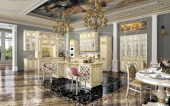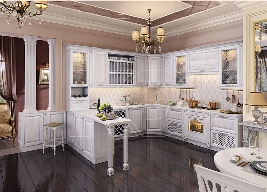 Классическая кухня обладает легко узнаваемыми чертами. Такая мебель спроектирована в строгом соответствии с требованиями симметрии, а для ее изготовления используются массив, шпон благородных пород или стилизованные под натуральное дерево современные материалы, такие как экомассив или экоплиты. Фасады гарнитуров украшает сложная фрезеровка, резные карнизы, колонны и балюстрады, для оформления часто служит лепнина, витражи из матированного стекла, решетки фигурных форм, инсталляции из кристаллов Swarovski.
