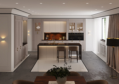 Гарнитур с островом – подходящая модель для квартиры-студии или загородного дома. С помощью такого комплекта можно визуально отделить обеденную зону от гостиной, используя островную конструкцию в качестве стола для приема пищи или дополнительной рабочей поверхности.