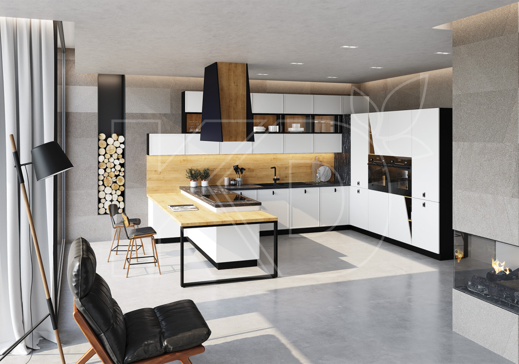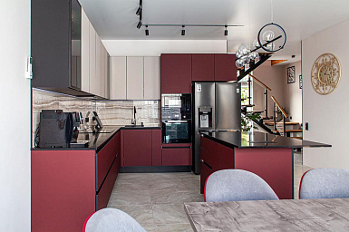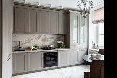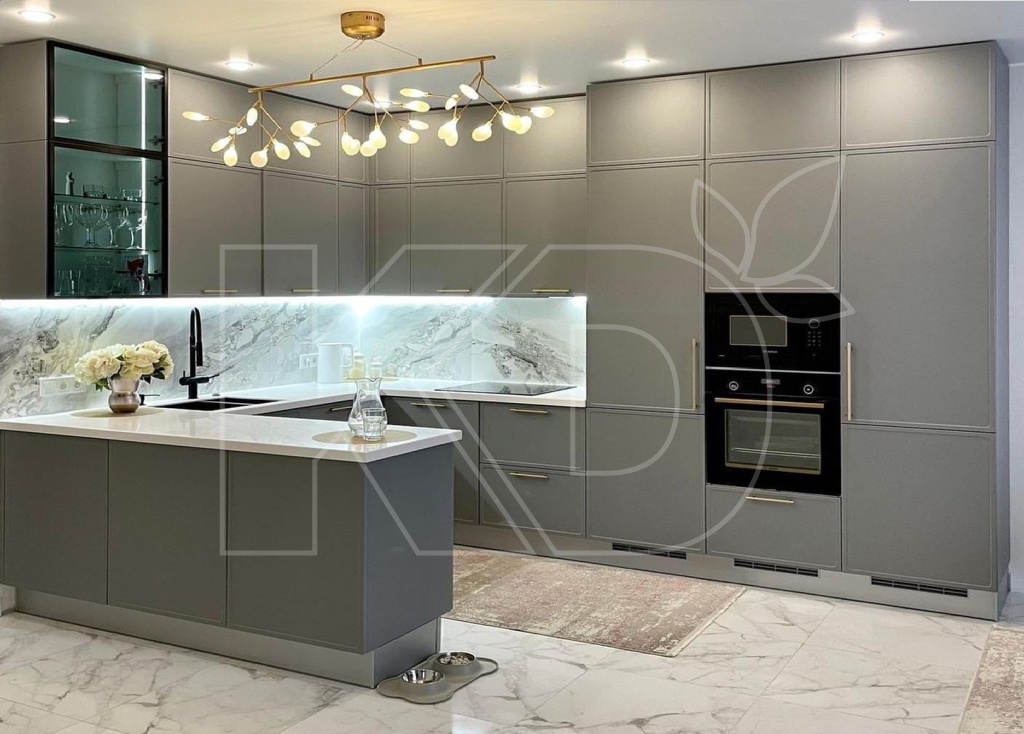 Конфигурация в виде буквы «П» – идеальное решение для обустройства рабочего треугольника. При этом между плитой, холодильником и мойкой соблюдается оптимальное расстояние, обеспечивающее комфортность и безопасность в процессе пользования.