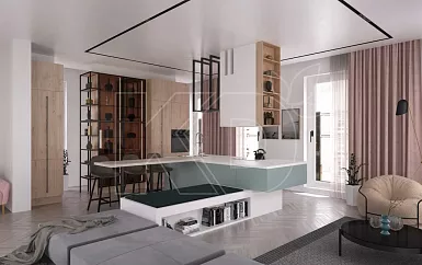 Остров используется для зонирования пространства, а также в качестве рабочей поверхности и обеденного стола. Если позволяют коммуникации, на нем можно установить варочную панель или раковину.