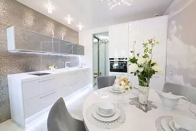 Для проходной прямоугольной комнаты лучше купить кухню в два ряда. Шкафы такого гарнитура выстраивают вдоль двух стен друг напротив друга, оставляя межу ними проход не меньше 1,2 метра. Такое расстояние обеспечит комфортное перемещение и не создаст неудобств во время открывания дверец.
