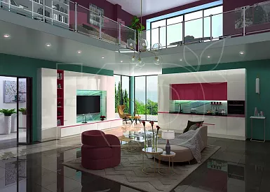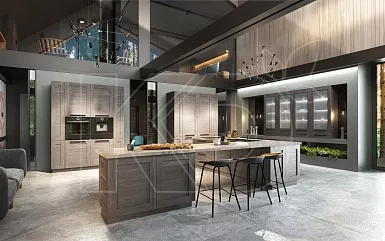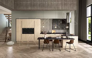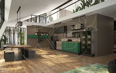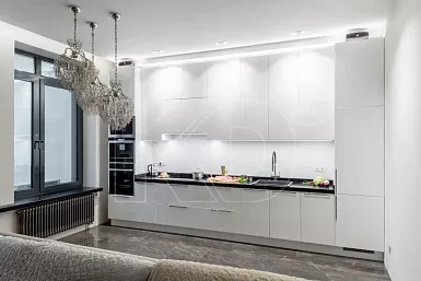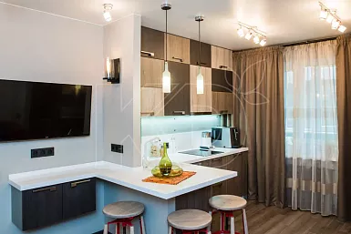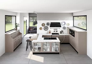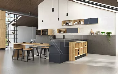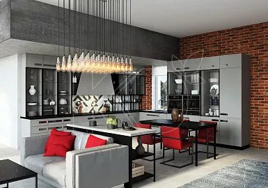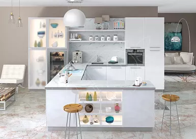 В просторных квартирах-студиях и отдельных помещениях площадью от 12 квадратных метров часто используют островные комплекты. Модули при такой планировке устанавливают вдоль одной или двух стен, в виде буквы П. Дополнительные навесные полки и шкафы часто размещают у окна.