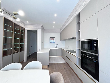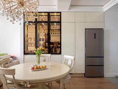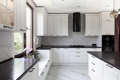 Так, для установки классической кухни потребуется большая площадь. Комплекты в стиле классика отличаются роскошной отделкой в виде позолоты, резьбы, лепнины, патины. Исходя из этого, для оформления стен и потолка следует использовать соответствующие элементы – многоярусные люстры, картины в резных рамах, дорогие обои с теснением и шелкографией. Напольное покрытие может быть каменным, деревянным или из искусственных материалов высокого качества.