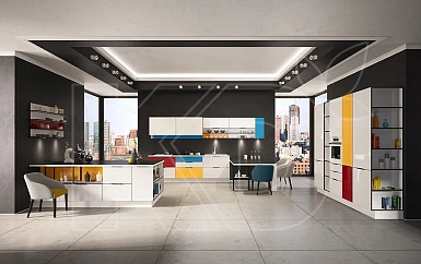 Для просторной комнаты, в которую попадает небольшое количество солнечного света, лучше купить кухню с фасадами оранжевого, желтого, красного или синего цвета. При этом важно, чтобы отделка стен и потолка была светлой и однотонной. Соблюдение этого правила позволит избежать дисгармонии и визуальной неряшливости.