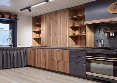Фасады из натуральной древесины являются самыми престижными и дорогими. Кухонные гарнитуры такого типа обладают высокой прочностью, эстетичностью и устойчивостью к внешним воздействиям. Покупка деревянной мебели – это одна из самых лучших инвестиций, так как подобные версии со временем не теряют привлекательности, не деформируются. При необходимости поверхности из дерева можно отреставрировать. К другим плюсам древесины можно отнести следующие показатели: