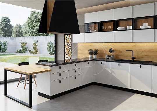 Черно-белая кухня в классическом исполнении выглядит элегантно. Однако принт с цветами сделает мебель более эффектной. При этом грамотное сочетание оттенков создаст гармоничное восприятие и визуально преобразит кухонное пространство. Для стилевого созвучия допустимо также подобрать стол с идентичным рисунком.