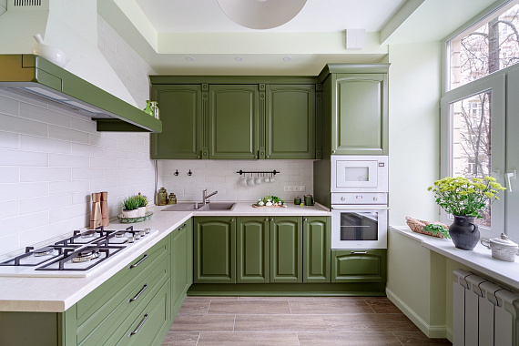 Г-образный кухонный гарнитур для маленькой кухни лучше всего размещать недалеко от окна. Естественное освещение не только наполняет интерьеры лёгкостью, но и обеспечивает хозяевам отличное настроение! А без него, как известно, вкуснятины не приготовишь!
