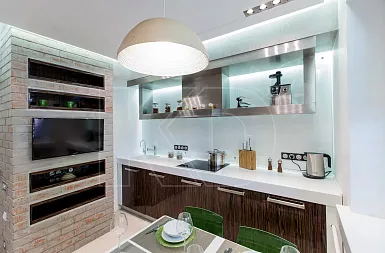 В малогабаритных квартирах, в которых нет места для отдельной обеденной зоны, полуостров может заменить стол для приема пищи. Особенно удачный вариант для такого случая – гарнитур с откидным элементом.