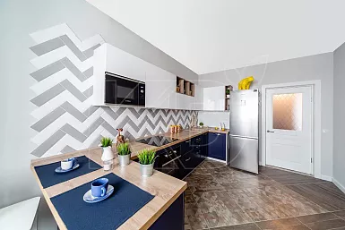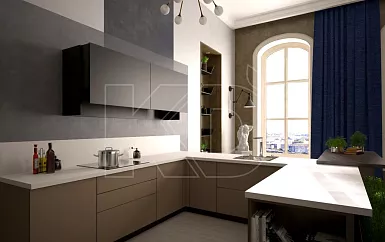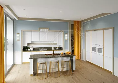 Планировка, при которой модули располагаются в виде буквы «П» вдоль трех смежных стен, обычно используется в больших помещениях. Подобное расположение считается одним из наиболее эргономичных, потому что позволяет придерживаться принципа рабочего треугольника. Холодильник, плита и мойка размещаются на одинаковом друг от друга расстоянии.