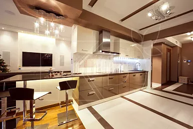 Барная стойка может использоваться в качестве дополнительной рабочей поверхности или обеденного стола. Другой плюс такой конструкции заключается в том, что она может использоваться для зонирования пространства.