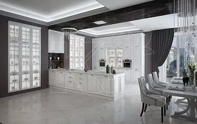 Для большей вместительности верхний ряд модулей белого комплекта делают двойным. В шкафах под потолком хранят банки для солений, праздничные сервизы и другие предметы, которые не требуются для ежедневного пользования.