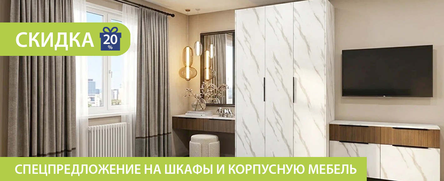 при выборе специальных акционных декоров вы получаете скидку до 20% на шкафы и корпусную мебель.